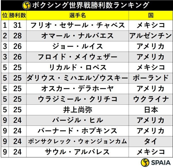 歴代最多の31勝を挙げたチャベス(メキシコ)に次ぐ2位には、井上がKO勝ちしたオマール・ナルバエス(アルゼンチン)が28勝で続く。さらにジョー・ルイスとメイウェザーが26勝で3位タイとなっており、次戦で井上が並ぶ可能性がある。
