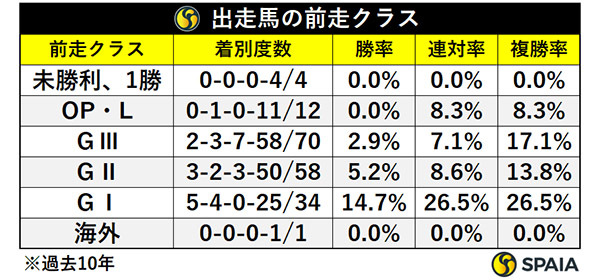 前走でGⅠを走っていた馬が強い。一方、未勝利戦や1勝クラス、もしくはオープンを走っていた組から1着馬は出ていない。
