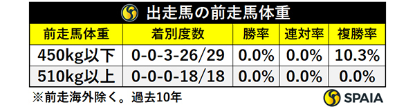 前走馬体重が450kg以下、もしくは510kg以上だった馬はすべて連対を外している。